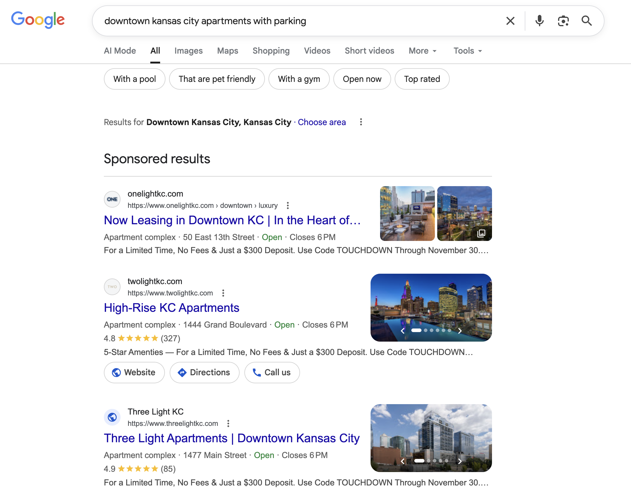 Say a prospective renter goes to Google and searches for “downtown kansas city apartments with parking." Here’s an example of what they could see: